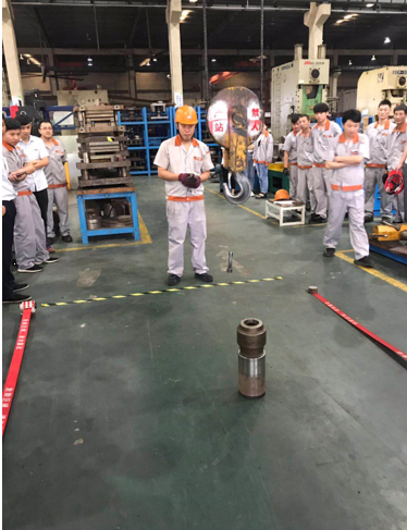 在比賽開始之前,工會主席呂曦紅、生產總監蔡云峰、研發中心工程師李軍輝都到現場進行了相應的賽前道具準備、場地劃線。同時對比賽的安全操作、比賽流程做了詳細的講解,以確保員工安全比賽、了解賽事規則。本項目之所以叫“趣味行車”比賽,就是需要三人接力、按照用時最短的原則,將一個圓柱物體用行車吊裝進空心的圓柱體內。這對于平時操作行車的熟練程度、技藝都有較高的要求。