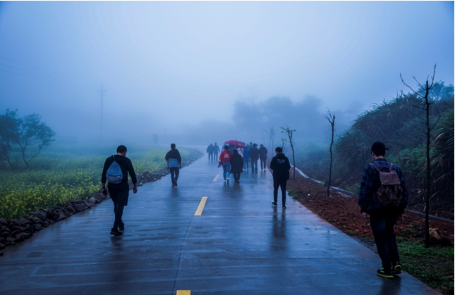 在各組成員吃飽喝足充滿能量之后 ,開始了此次活動最高潮部分——暴走。在開始暴走之前,參加暴走的全體成員在自行車協會牌前集合進行了合影留念,之后開始了暴走活動。天氣依然是跟早上一樣,三米開外的地方,似乎什么都看不清了,天空中也下著蒙蒙細雨,但一點也不影響我們的心情。大家一邊歡快地聊著天,一邊向上地攀登者。享受著霧蒙蒙的風景,在這詩情畫意中繼續著。很快我們從平坦的水泥路轉到了泥濘的山路中。疊翠的峰巒、茂密的森林和曲折盤旋的山路讓我們不禁陶醉其中,盡情領略大自然的風情。各個部門之間都彼此相互鼓勵、相互協助,不斷挑戰著自己。