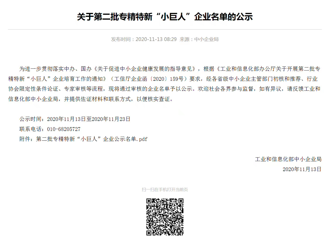 根據(jù)《關(guān)于組織推薦第二批國家級專精特新“小巨人”企業(yè)》文件通知要求,我司通過地方經(jīng)信推薦,符合申報要求,積極準備相關(guān)資料上報,經(jīng)各地經(jīng)信部門初審、市級相關(guān)部門會審以及省級專家評審,我司順利通過評審,成功入選“國家級專精特新“小巨人”名單,取得國家級榮譽,并在工信部平臺上予以公布。